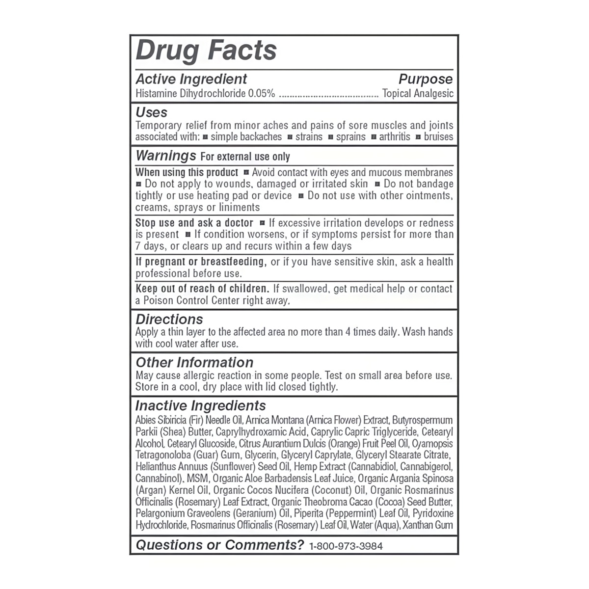 Ingredients Water (Aqua), Histamine Dihydrochloride 0.05%, Methylsulfonylmethane (MSM), Helianthus Annuus (Sunflower) Seed Oil, Arnica Montana (Arnica Flower) Extract, Cetearyl Alcohol, Caprylic Capric Triglyceride, Glyceryl Stearate Citrate, Cetearyl Glucoside, Glycerin, Pyridoxine Hydrochloride, Butyrospermum Parkii (Shea) Butter, Organic Argania Spinosa (Argan) Kernel Oil, Organic Cocos Nucifera (Coconut) Oil, Organic Aloe Barbadensis (Aloe Vera) Leaf Juice, Organic Theobroma Cacao (Cocoa) Seed Butter, Cyamopsis Tetragonoloba (Guar) Gum, Hemp Extract (Cannabidiol, Cannabigerol, Cannabinol), Organic Rosmarinus Officinalis (Rosemary) Leaf Extract, Piperita (Peppermint) Leaf Oil, Rosmarinus Officinalis (Rosemary) Leaf Oil, Citrus Aurantium Dulcis (Orange) Fruit Peel Oil, Pelargonium Graveolens (Geranium) Oil, Abies Sibiricia (Fir) Needle Oil, Glyceryl Caprylate, Xanthan Gum, and Caprylhydroxamic Acid.