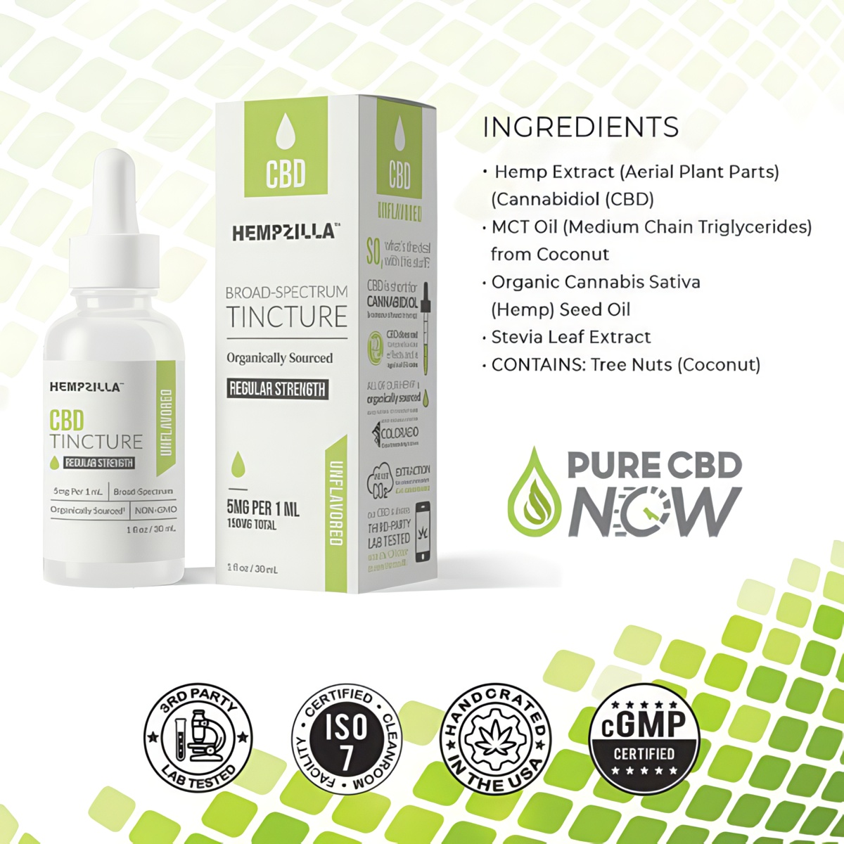 REGULAR STRENGTH: Servings: 30, Serv. size: 1 mL Amount per serving: Calories 10, Total Fat 1g (1% DV), Hemp Extract Oil (Aerial Plant Parts) (Cannabidiol (CBD) 5mg), 7mg** Other Ingredients: MCT Oil (Medium Chain Triglycerides) from Coconut, Organic Cannabis Sativa (Hemp) Seed Oil, Stevia Leaf Extract. CONTAINS: Tree Nuts (Coconut)