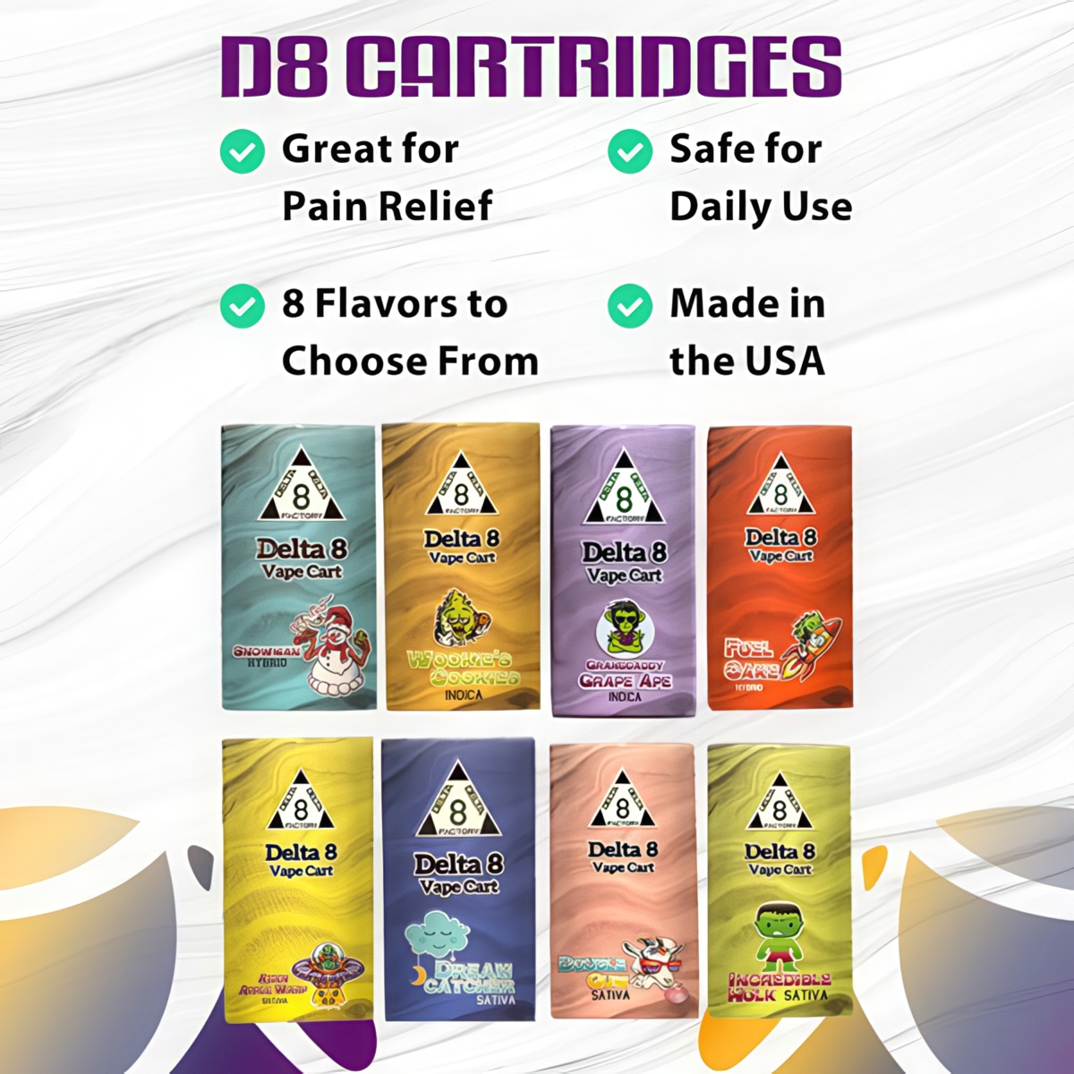 The Delta 8 Factory takes vaping to a whole new level with their Exotic Regular and Live Terpene Carts. Offering a rich selection of strains, these cartridges ensure every session is as unique as you are. The vape oils come in both ‘regular’ and live resin forms, meaning you can switch it up whenever the mood strikes.