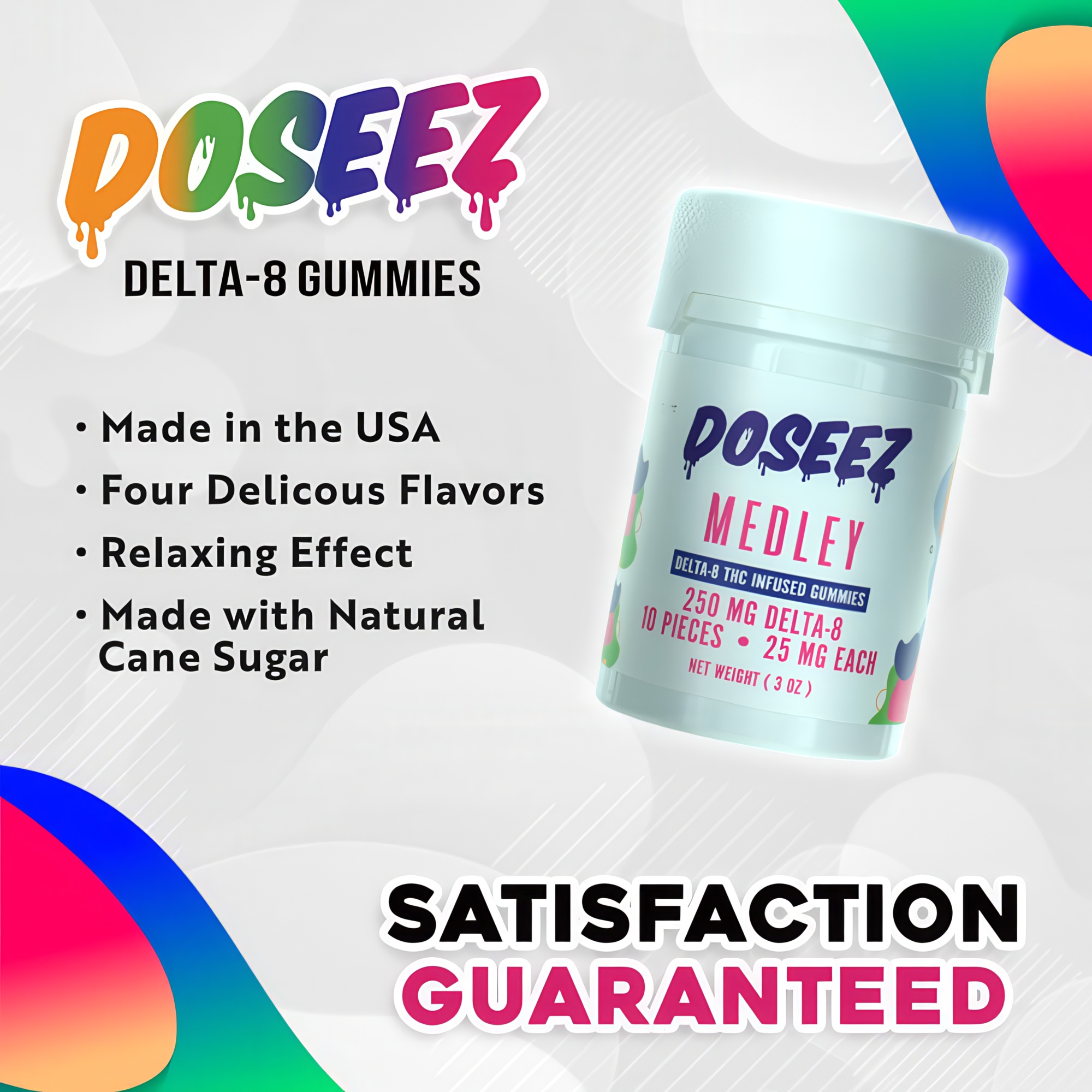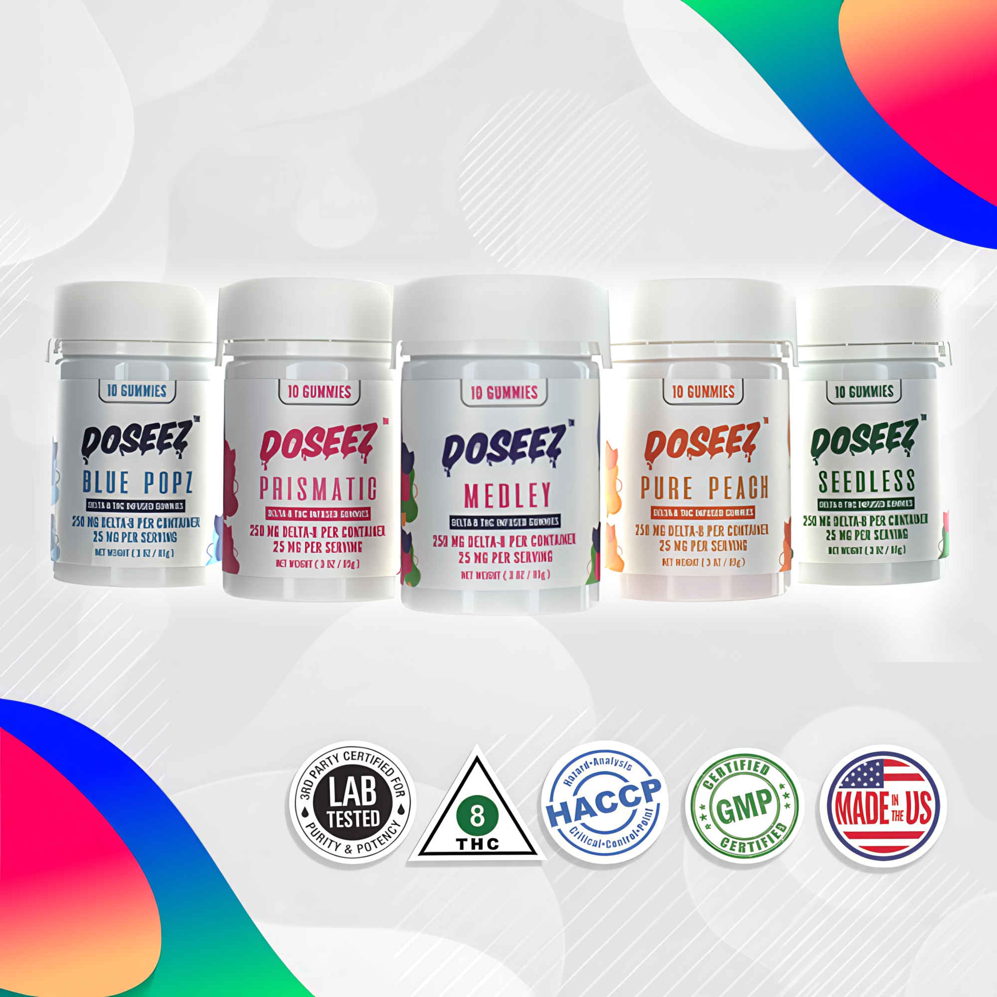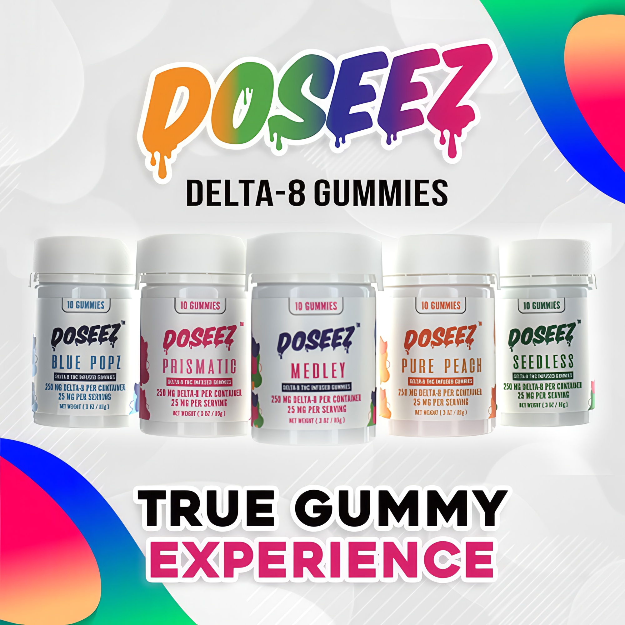 Introducing the Doseez Delta-8 THC Gummies – a delightful pack of 10 tantalizing treats that are not just delicious, but also packed with a 25mg kick of Delta-8 THC each. As if the unique blend of tangy and sweet in every bite wasn’t enough, the folks at Doseez go the extra mile with five spectacular flavors to choose from.