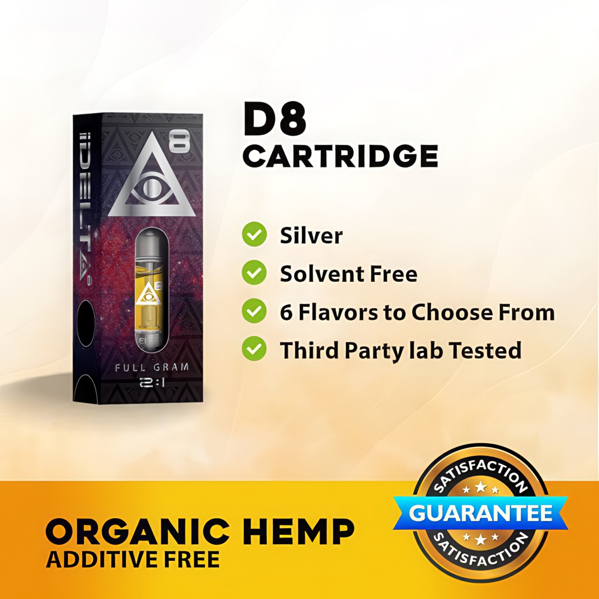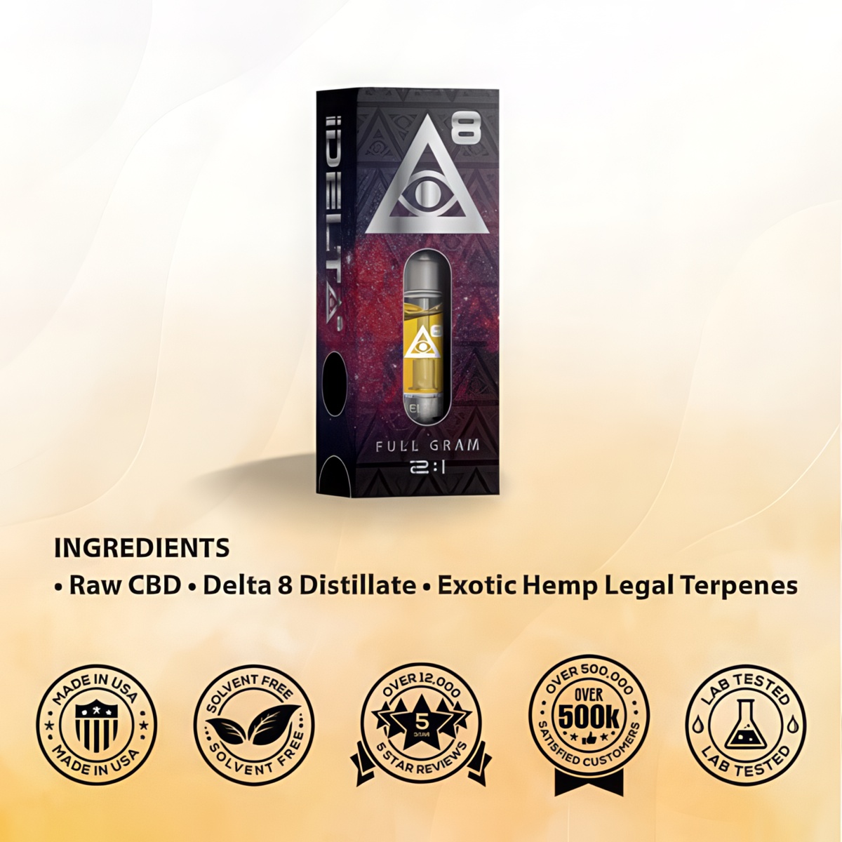 100% additive-free Compatible with 510-threaded battery devices Organic hemp-derived goodness Proudly made in the USA Solvent-free for purity Durable Pyrex glass construction Comforting 2:1 CBD to delta 8 THC ratio 1 gram (1ml) of vaping pleasure