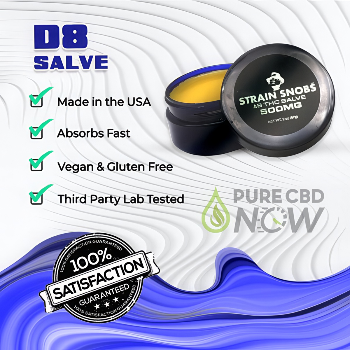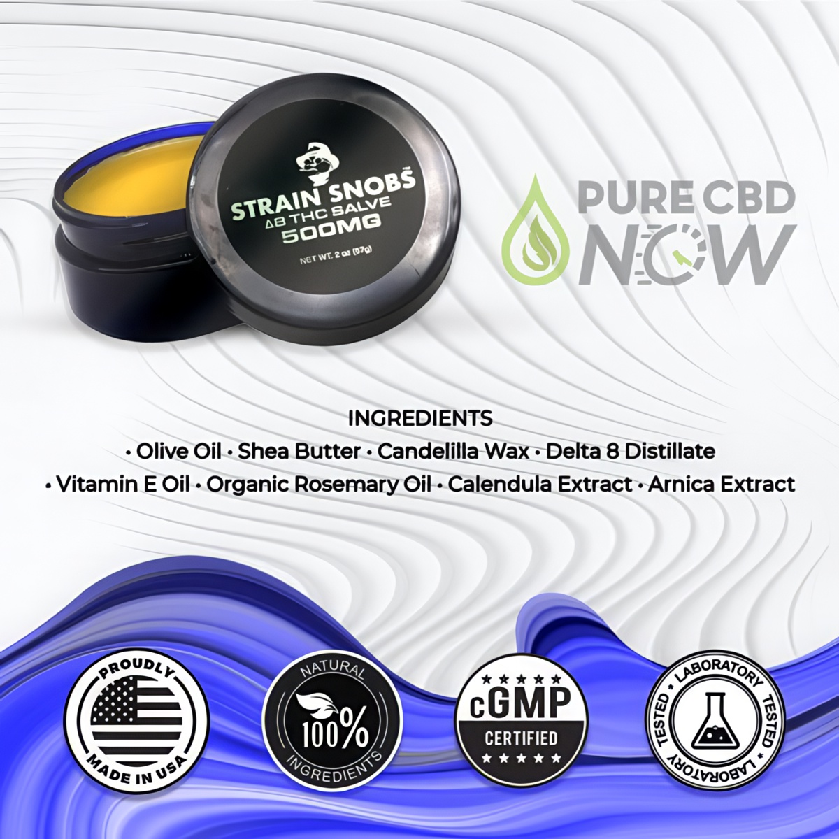 The Delta 8 Salve from Strain Snobs is a unique type of hemp topical that blends together CBD and delta 8 THC to offer maximum cannabinoid absorption into the body in a more targeted manner. Apply as needed and allow just a few moments for the compounds to absorb before they’re fully active for up to 6 hours.